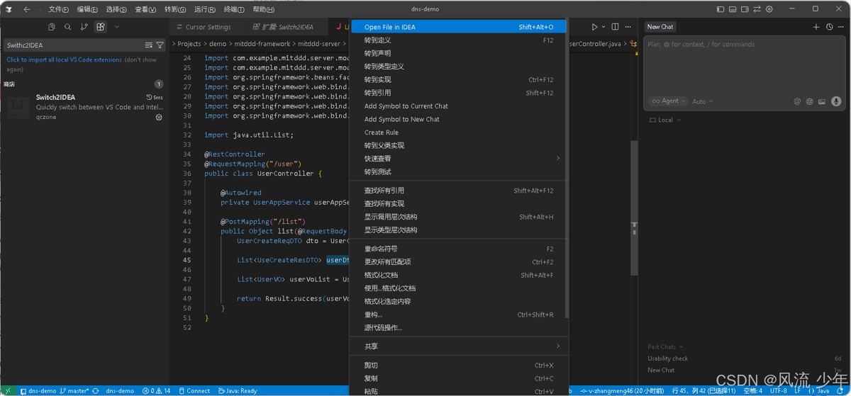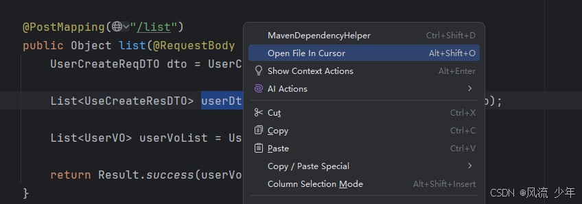 一般使用使用Cursor进行AI编程,使用IDEA进行代码调试,使用快捷键alt+shfit+O 可以快速跳转到idea文件,并将代码行光标同步为cursor位置。