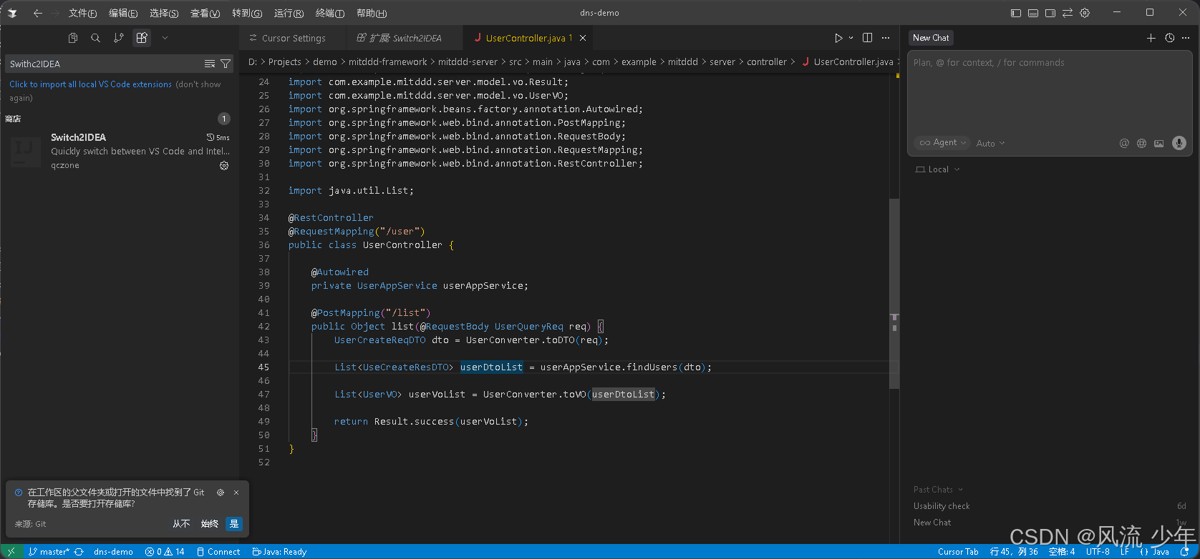 如果出现运行报错可以直接让cursor解决即可。右边的New Chat 通过快捷键 Ctrl + Shift + L 打开,输入”项目启动报错,请解决“。