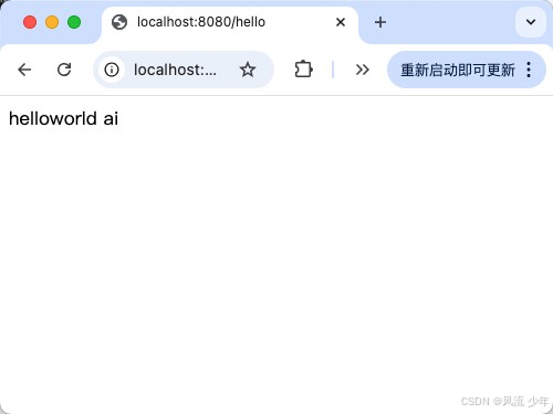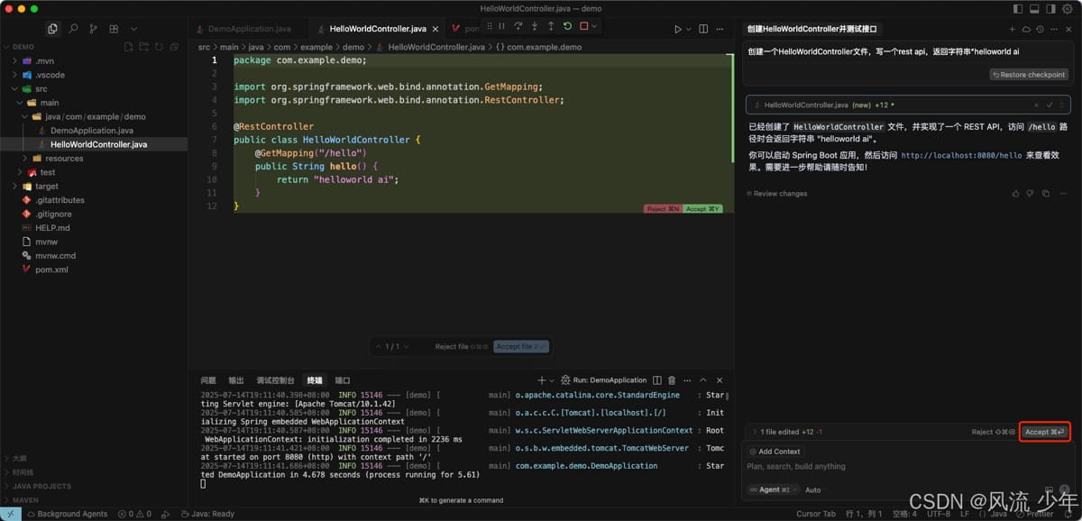 在Chat中输入”创建一个HelloWorldController文件,写一个rest api,返回字符串”helloworld ai “。代码生成好时需要点击Accept来接收AI生成的代码。