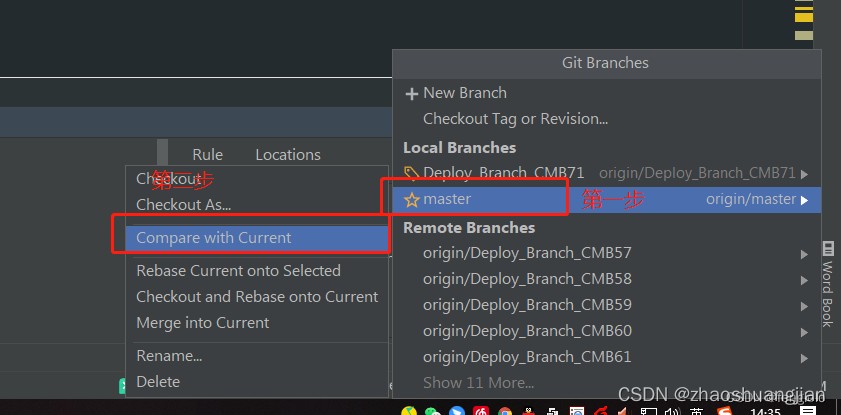 找到Local Branches,鼠标左键选中master分支,在弹出的框中,选择compare with Current