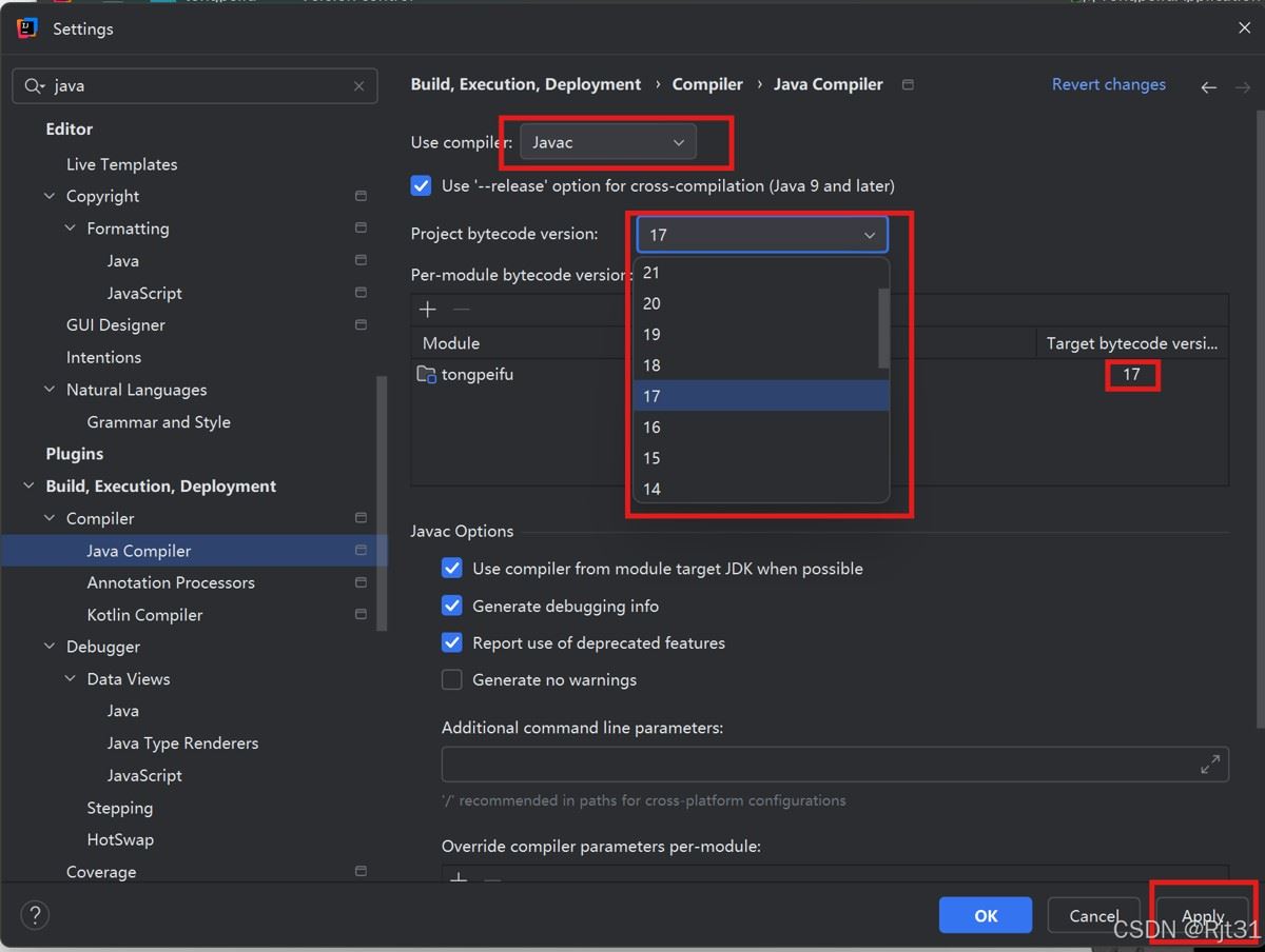 1.点击 file --> settings,打开 settings 确定 Java compiler 的 Project bytecode version 是否选中项目需要的jdk版本。