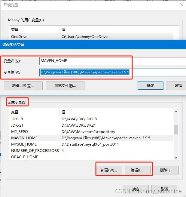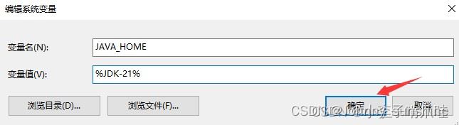 “JAVA_HOME”,变量值为"%JDK-21%“,没有配置过的就新建。