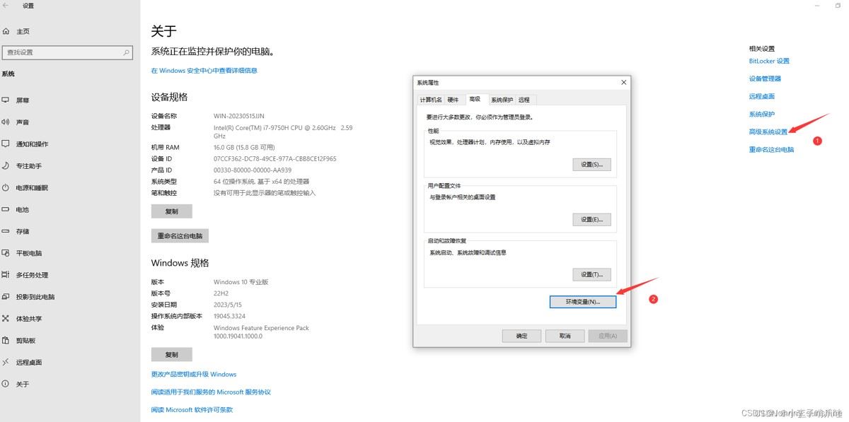 开始->设置->系统->关于->高级系统设置->环境变量