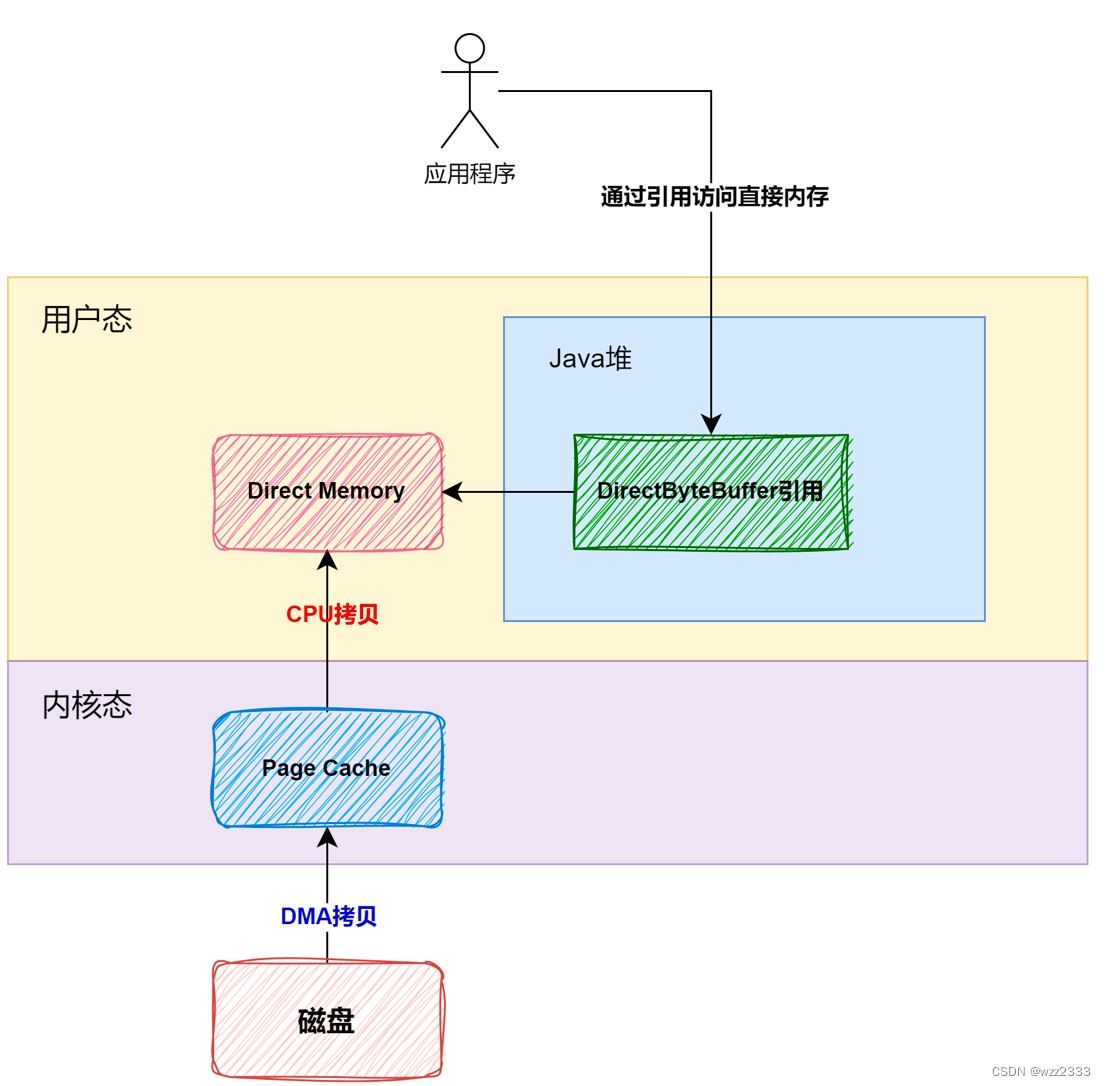 - 再从系统缓冲区拷贝到用户态的堆外内存(JVM实现)
