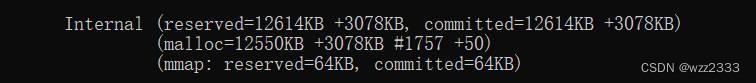 // 打印NMT信息 jcmd <pid> VM.native_memory detail // 进行baseline,以对比分配内存变化 jcmd <pid> VM.native_memory baseline // 对比baseline, 显示出各个部分内存的变化 jcmd <pid> VM.native_memory detail.diff