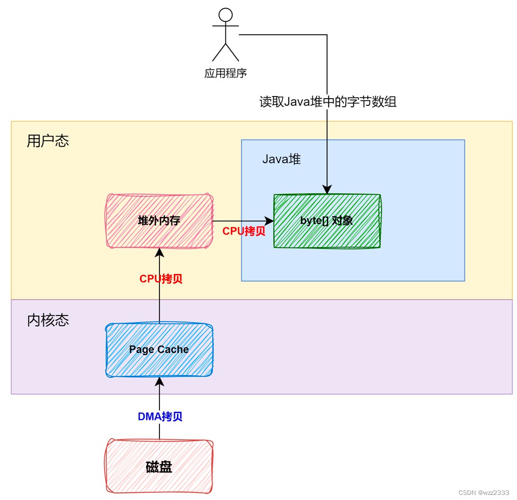 - 然后再从堆外拷贝到 Java 堆内的 byte 数组(用户地址空间)。