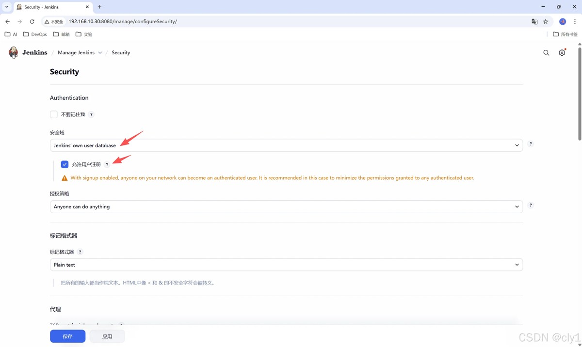 安全域(Security Realm):保持为 Jenkins 专有用户数据库