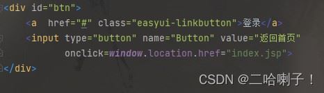 <div id="btn"> <a href="#" rel="external nofollow" class="easyui-linkbutton">登录</a> <input type="button" name="Button" value="返回首页" onclick=window.location.href="index.jsp" rel="external nofollow" > </div>