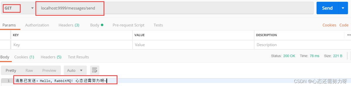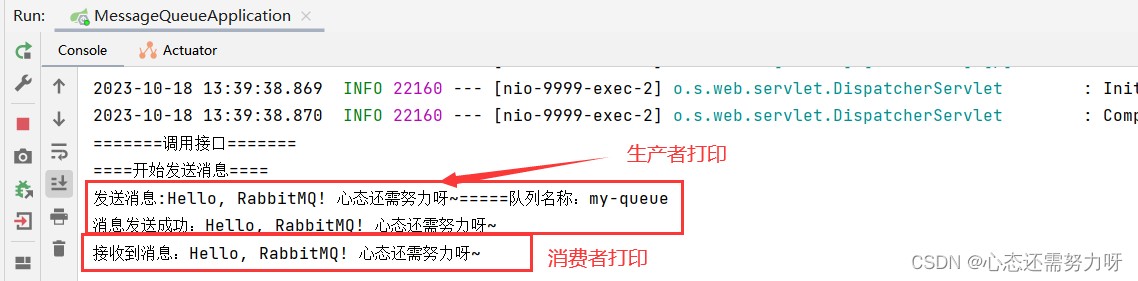 String message = "Hello, RabbitMQ! 心态还需努力呀~";