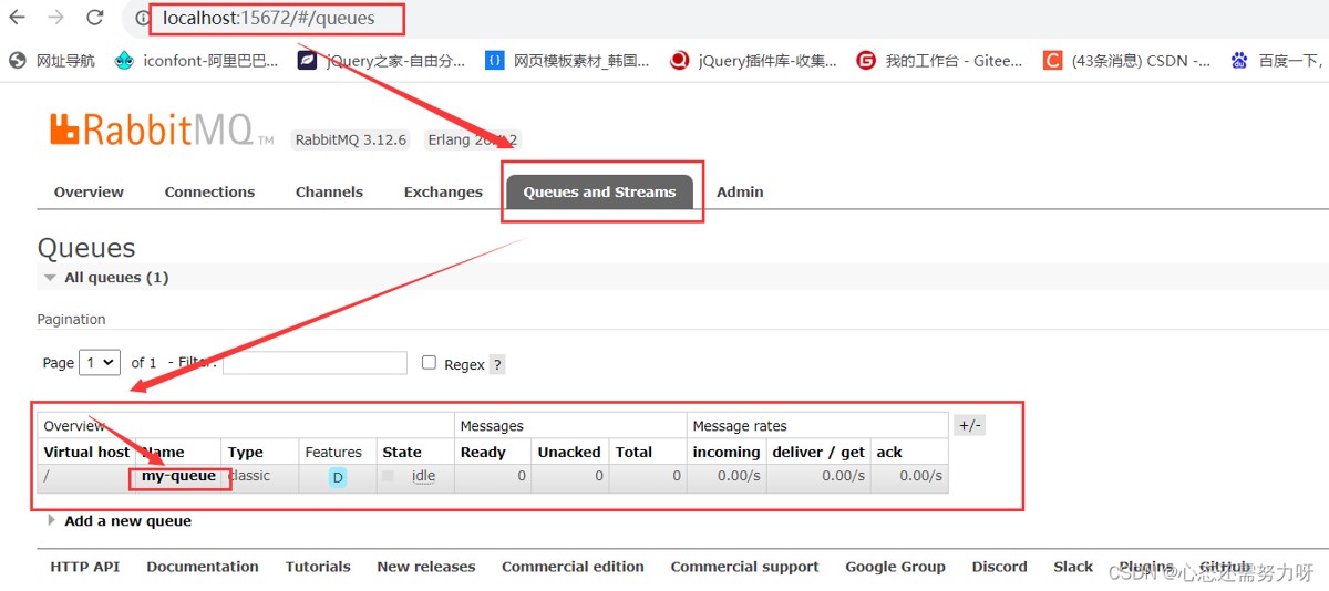 下载完成后启动rabbitmq,然后在浏览器中访问localhost:15672接口进行登录,默认用户名、密码都是guest,登录后在下图所示的“Add a new queue”进行创建队列。