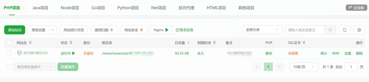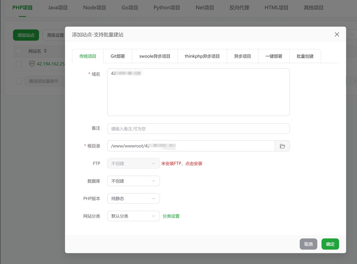 去添加站点,域名暂时是自己的公网(宝塔左上角那个地址)