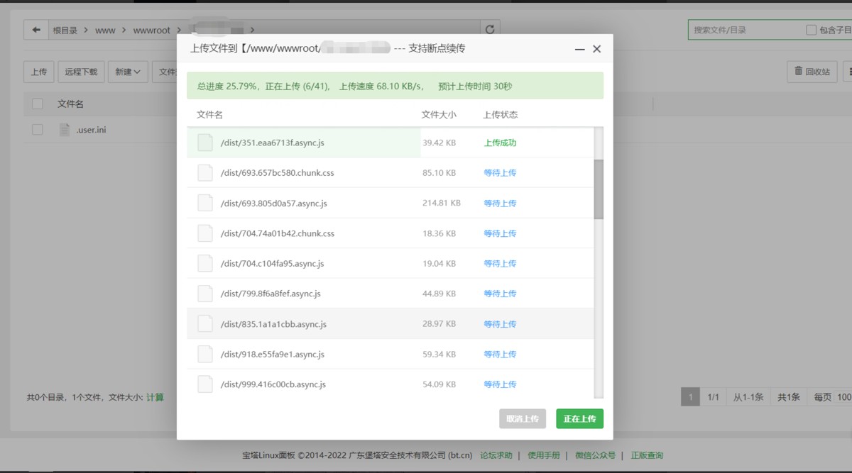 打开新建的站点,把里面的文件全删掉,再把自己的前端dist里的文件全选拖进去上传