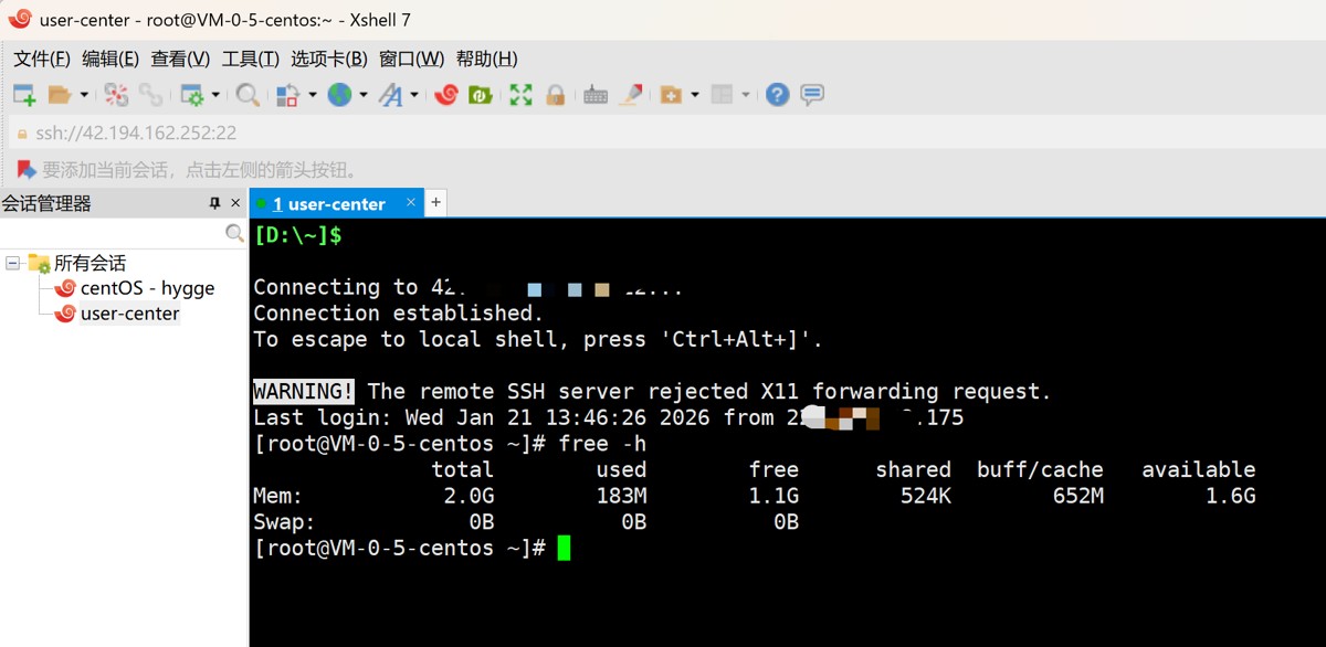 本地环境:项目无编译错误,可通过mvn clean package成功打包;安装远程连接工具(Xshell / FinalShell)并连接,我这里使用的是Xshell。(使用 free -h可以查看你的服务器信息)