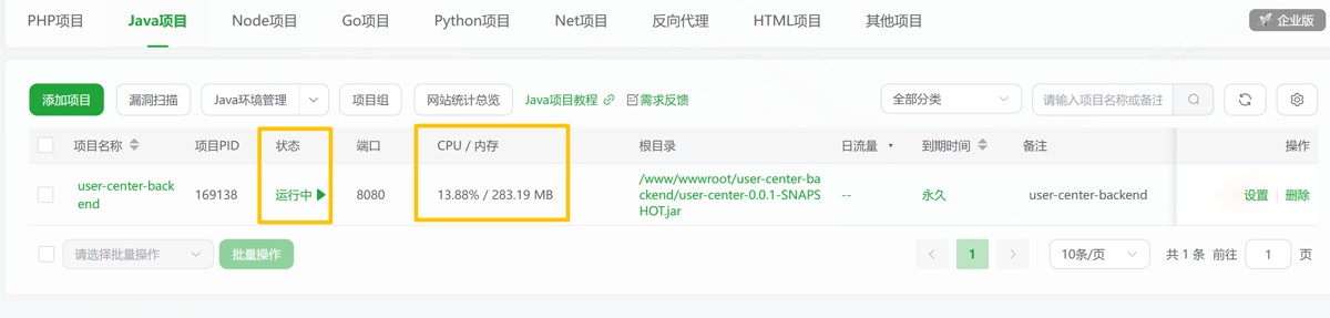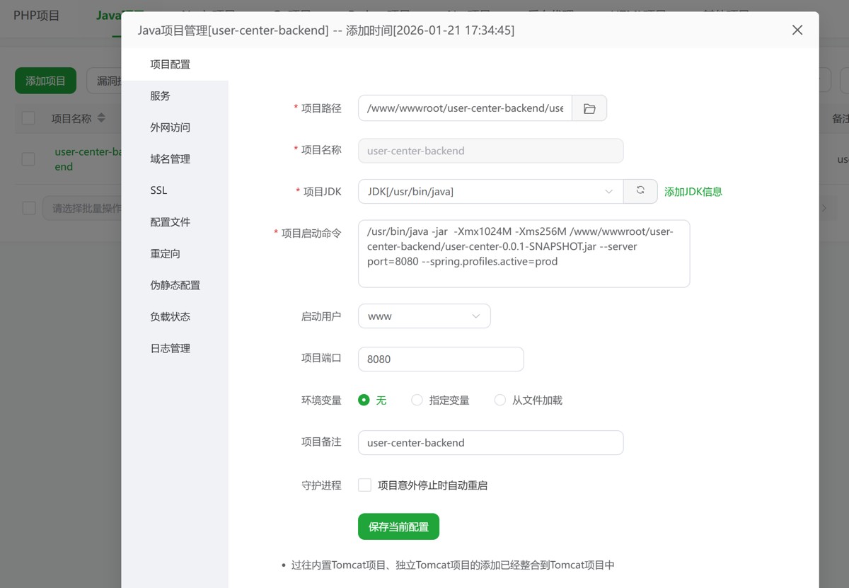 # 创建目录 mkdir -p /www/wwwroot/user-center-backend # 将本地打包好的后端 Jar 包上传到服务器指定目录(可通过scp命令或FTP工具) scp 本地Jar包路径 root@服务器公网IP:/www/wwwroot/user-center-backend