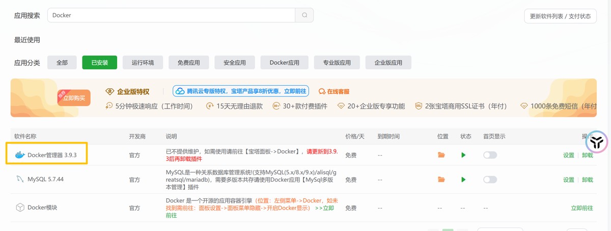 远程连接服务器,安装Docker / 或使用宝塔Linux的服务商店下载Docker