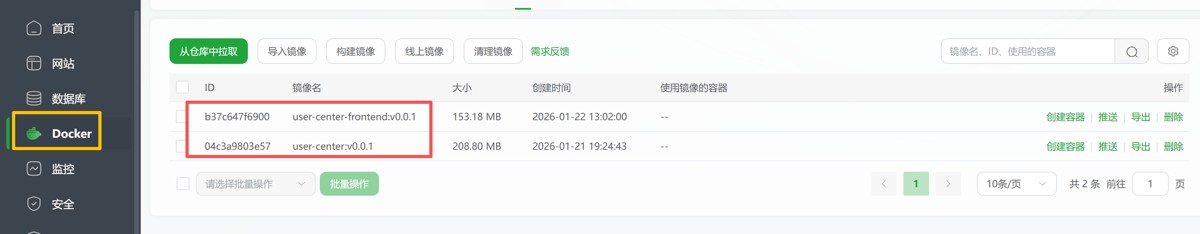 后端:docker run -p 8080:8080 user-center-backend:v0.0.1 前端:docker run -p 80:80 -d user-center-frontend:v0.0.1