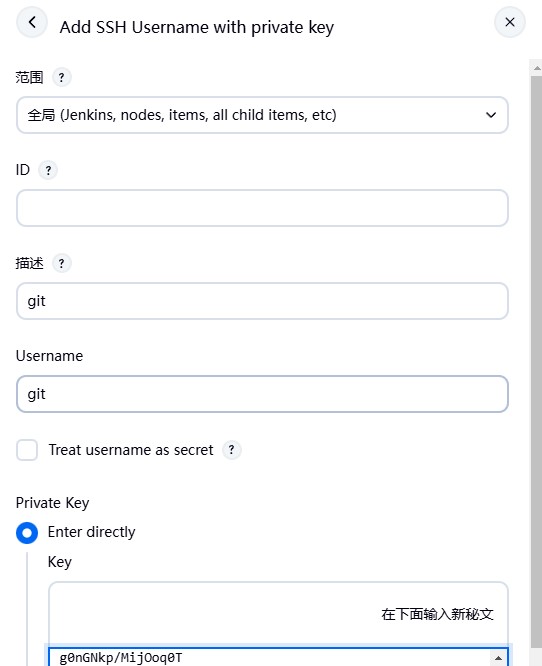 5. 这里我们使用的是秘钥认证方式,由于jenkins是通过docker compose管理容器,推荐在宿主机上生成密钥对,然后挂载到容器中,公钥配置到git仓库SSH配置中,私钥粘贴到下图Key中,这样jenkins就可以免交互的拉取git仓库 中的代码了。