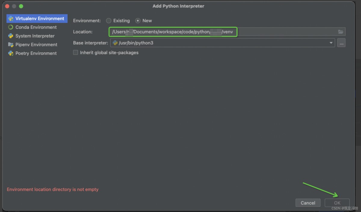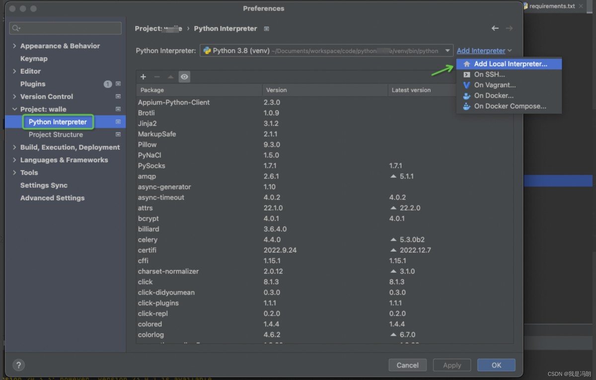 $ cd /Users/fl/projectA 到工程目录下 $ python3 -m venv venv 前提是本地得安装Python3,最后一个venv表示虚拟环境的名字 ,也可以起别的名字,这里我们建议和PyCharm内的保持一致 $ source venv/bin/activate 激活虚拟环境 然后再执行python -V和pip -V看看虚拟环境是否生效,如果返回结果都待了env的标识说明已经切成功了 $ python -V Python 3.8.8 (env) $ pip -V pip 20.2.3 from /Users/fl/projectA/env/lib/python3.8/site-packages/pip (python 3.8) (env) $ pip install -r requirements.txt -i https://pypi.tuna.tsinghua.edu.cn/simple/ 安装依赖