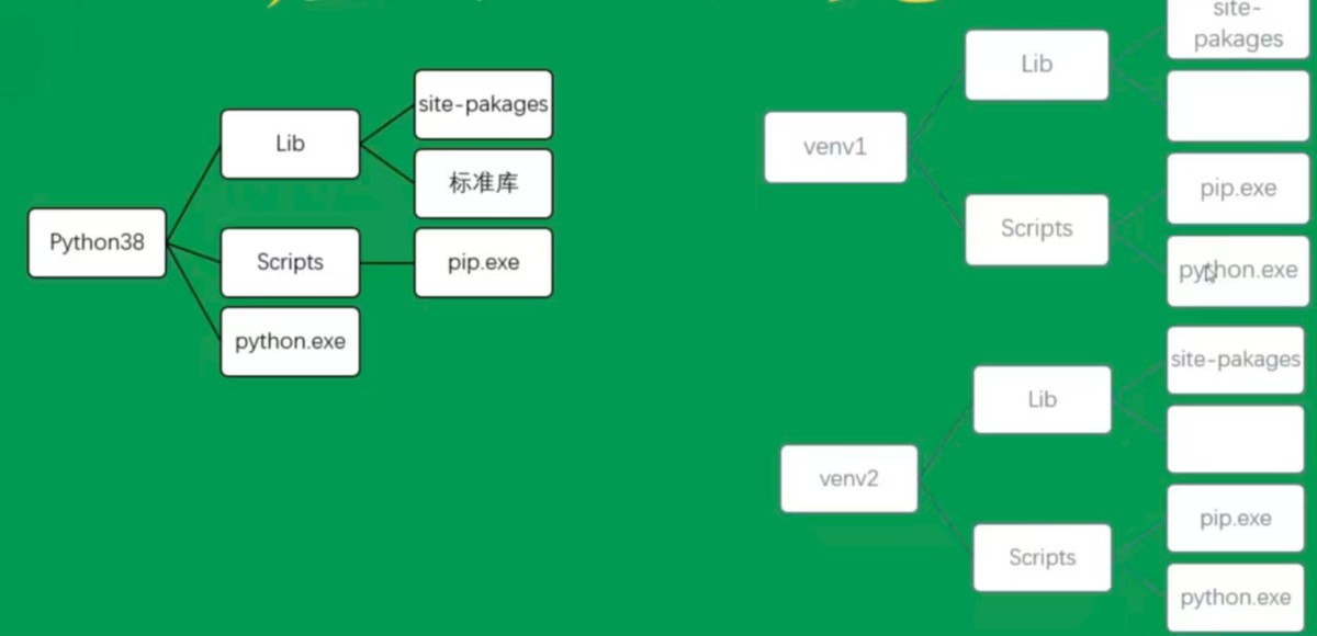 python虚拟环境就是把原本的python文件目录复制出一个的目录,只不过在原python环境中python解释器python.exe在主目录下,虚拟环境中的python.exe被放在了Scripts中,每一个虚拟环境都有独立的site-packages放自己的包。