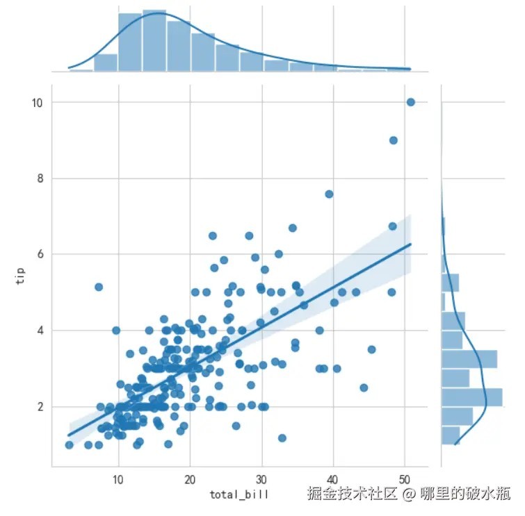 sns.jointplot(data=df, x='total_bill', y='tip', kind='reg') plt.show()
