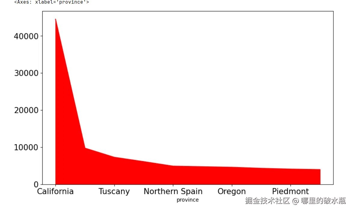 kwords = dict(fontsize=15, figsize=(10, 6), color=['r', 'g', 'b', 'y', 'c', 'm', 'k', 'pink', 'gray', 'orange']) df['points'].value_counts().sort_index().plot.bar(**kwords) # 柱状图 df['points'].value_counts().sort_index().plot.area(**kwords) # 面积图 df['points'].value_counts().sort_index().plot.line(**kwords) # 折线图