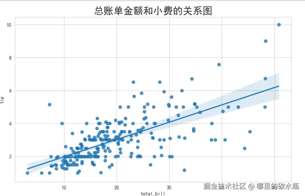 # 拟合回归线 sns.regplot(data=df, x='total_bill', y='tip')
