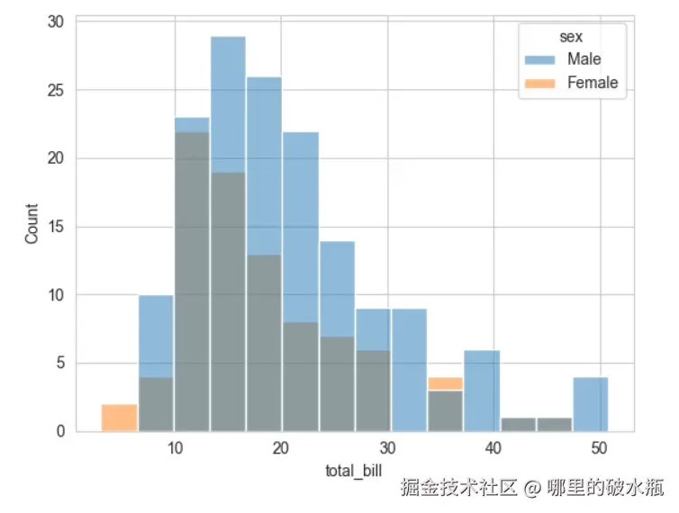 # x轴。总账单,y轴,消费,按照性别分组