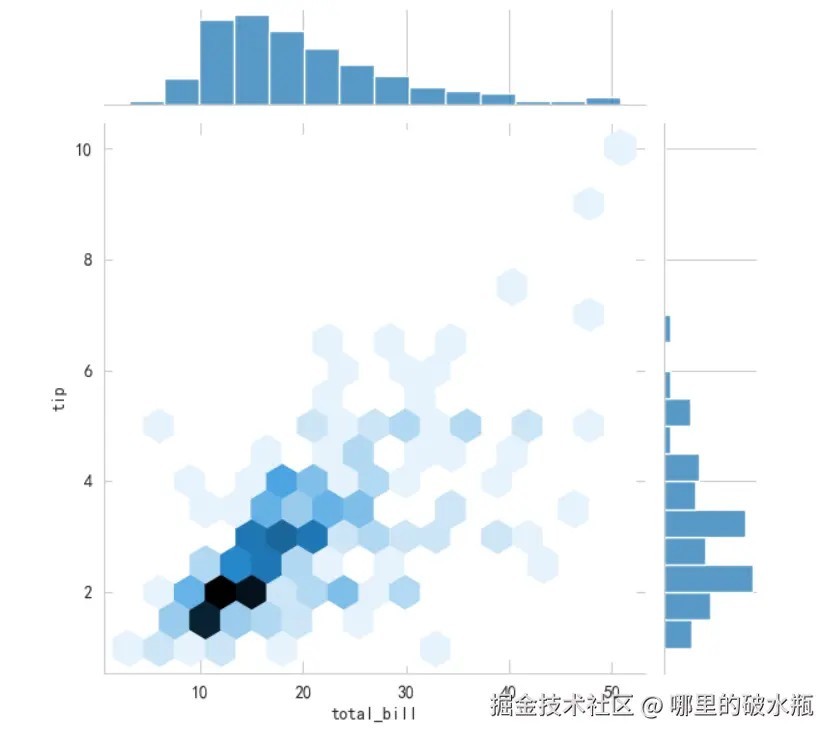 sns.jointplot(data=df, x='total_bill', y='tip', kind='hex') plt.show()