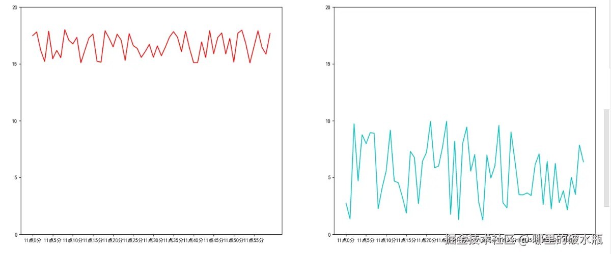 # 准备数据 x = range(60) # 第一个图的数据 y = [random.uniform(15, 18) for i in x] # 第二个图的数据 m = [random.uniform(1, 10) for i in x] plt.figure(figsize=(10, 5), dpi=80) # 绘制第一个线 plt.plot(x, y, label='北京') # 绘制第二个线 plt.plot(x, m, label='摩诃')