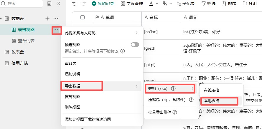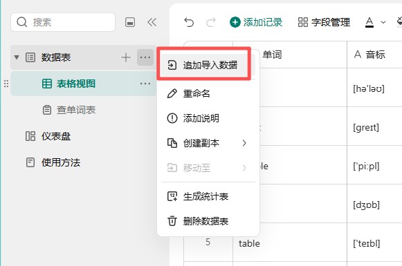 在数据表中,导入WPS表格,至少有一列,列名为单词。再点击数据表旁边的三个点,选择【追加导入数据】,导入后,系统会自动查询单词