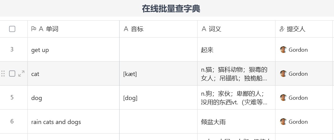 在这个项目中,我们采用WPS多维表+Python爬虫,通过调用小牛机器翻译API或爬取网页内容的方法,并回填到多维表页面上,实现了一个在线批量查字典的功能,不仅可以查单词,还可以查询短语。如果是短语就直接调用小牛机器翻译进行翻译,如果是非英文的语言,直接用小牛机器翻译自动识别,然后翻译成中文。