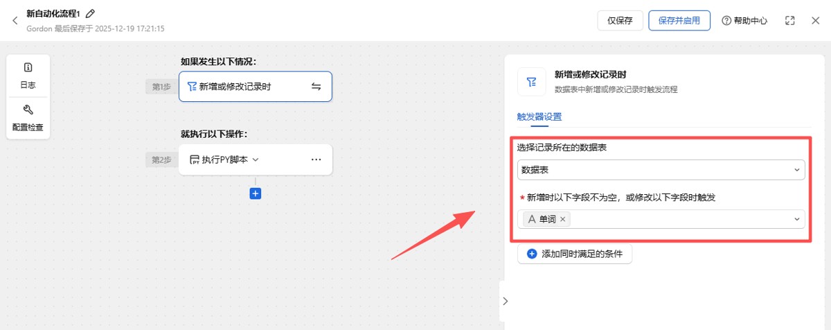 首先设置一个触发条件,也就是新增或修改记录是触发。