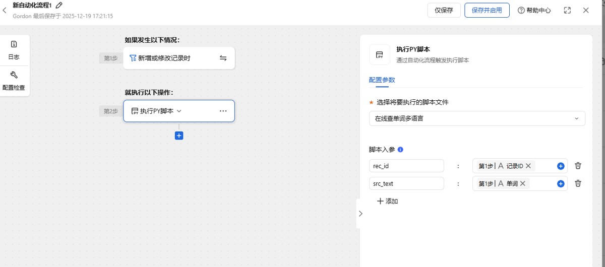 接着要设置一下脚本入参,有两个参数,一个是rec_id,是记录的ID,另一个传入PY代码的是是单词列的文本。