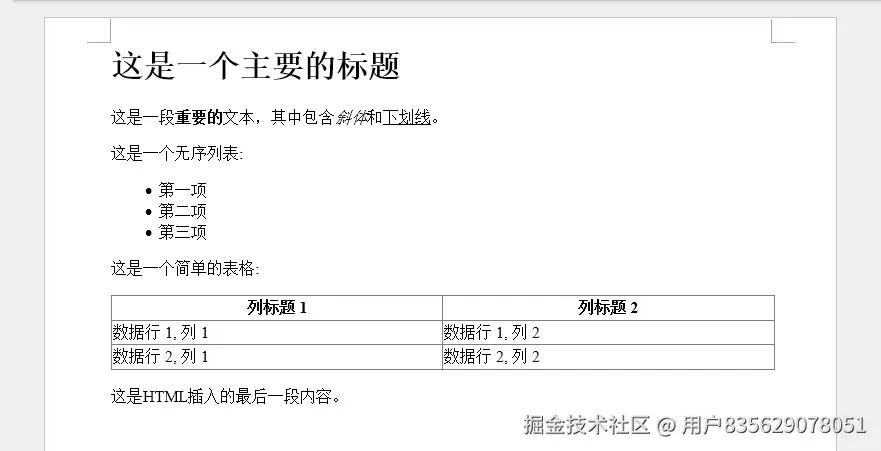 以下代码将演示如何创建一个新的Word文档,并向其中插入一段包含标题、段落、列表和表格的HTML内容。