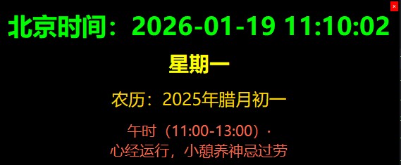 今天想和大家分享一个有趣又有用的小项目——如何使用 Python 编写一个集成了公历、农历和中医十二时辰养生提示的桌面时钟。这个项目不仅实用,还能让我们在快节奏的生活中,偶尔抬头看看屏幕,就能得到一份来自古老智慧的关怀。