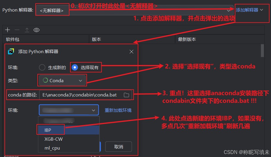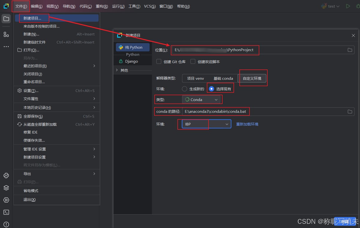 此时我们按照下图所示,新建一个工程,并“自定义环境”,环境选择“选择现有”,类型为“conda”,conda的路径是重点,必须选择anaconda安装路径下、condabin文件夹下的conda.bat,而环境选择新建好的虚拟环境IBP