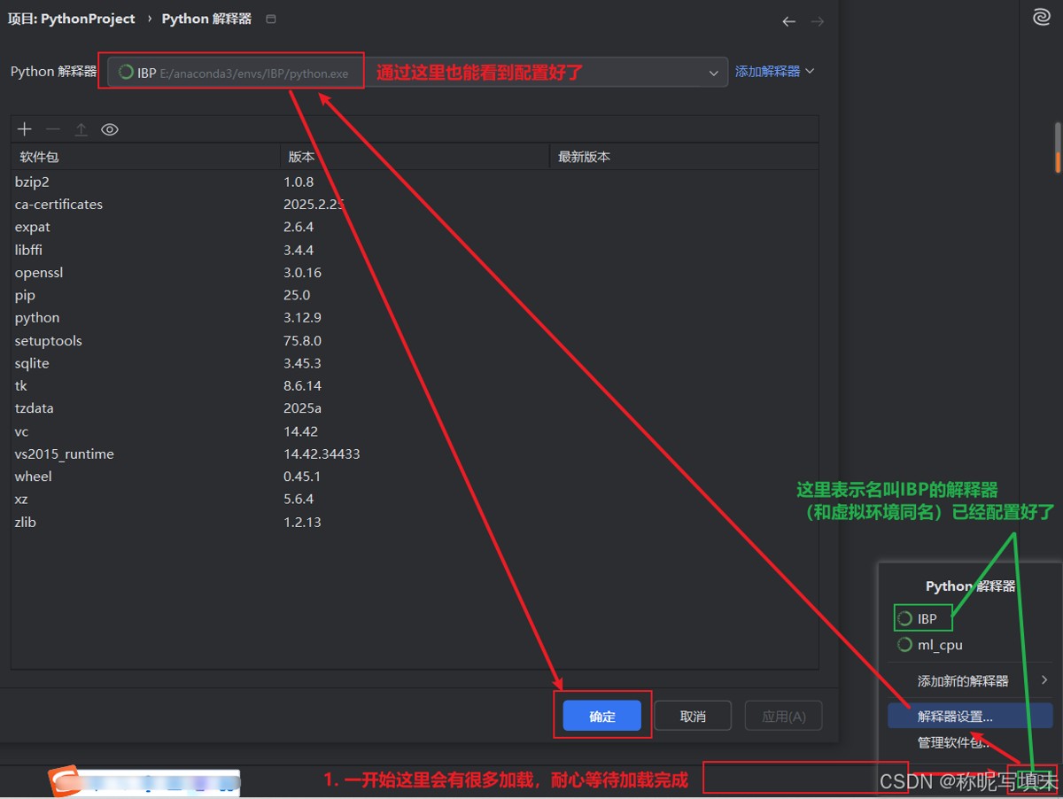 (1)在“PyCharm Community Edition 2024.3.4”提供了一种添加Python解释器的方法,该方法可以“不用手动在anaconda prompt”当中新建虚拟环境(即“一、创建虚拟环境”中的IBP),而自动根据选定的Python版本(如下图的3.12版本)、创建自定义名称(如下图hahaha)的虚拟环境。
