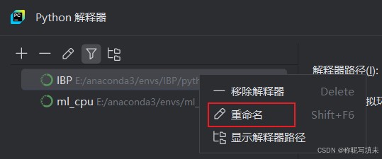 虚拟环境和Python解释器都叫做IBP可能容易混淆,在上图“Python解释器”的下拉菜单选择“全部显示”,选中一个解释器右键可以根据喜好重命名