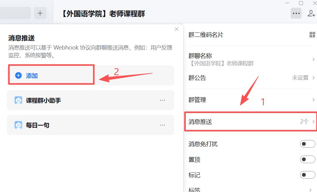 用电脑打开企业微信群,点击右上角的三个点,选择【消息推送】,再点击【添加】可以添加微信机器人。