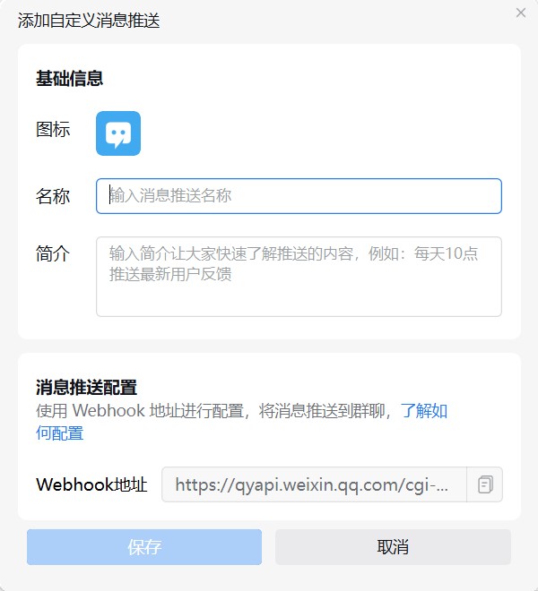 再选择【自定义消息推送】, 设置一个推送机器人图标、名称和简介,并记下它的webhook地址备用。