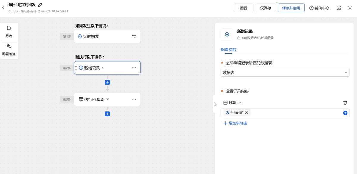 接下来,新增时间记录,执行PY脚本,并传入当前新增记录ID,这样代码就可以把每日英语写入到上一步的新增记录里。最后还要点击【保存并启动】,启用当前流程。