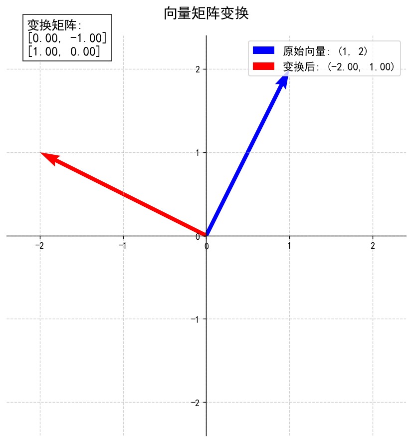 # 向量旋转示例(90度旋转矩阵) v = [1, 2] M_rotation = np.array([[0, -1], [1, 0]]) plot_vector_transformation(v, M_rotation, "vector_rotation.png")