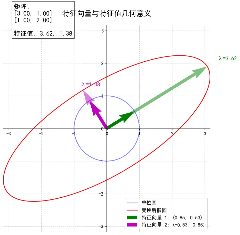 - 绿色和品红色箭头为特征向量,变换后方向不变,长度由特征值(λ1=3.30\lambda_1=3.30λ1=3.30, λ2=1.70\lambda_2=1.70λ2=1.70)决定;