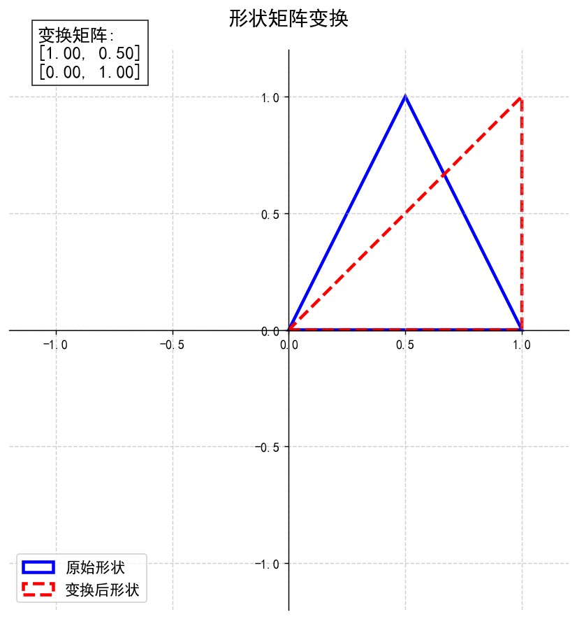 可视化效果:蓝色箭头为原始向量,红色箭头为变换后向量,坐标系自动适配向量范围,矩阵以文本形式显示于右上角。