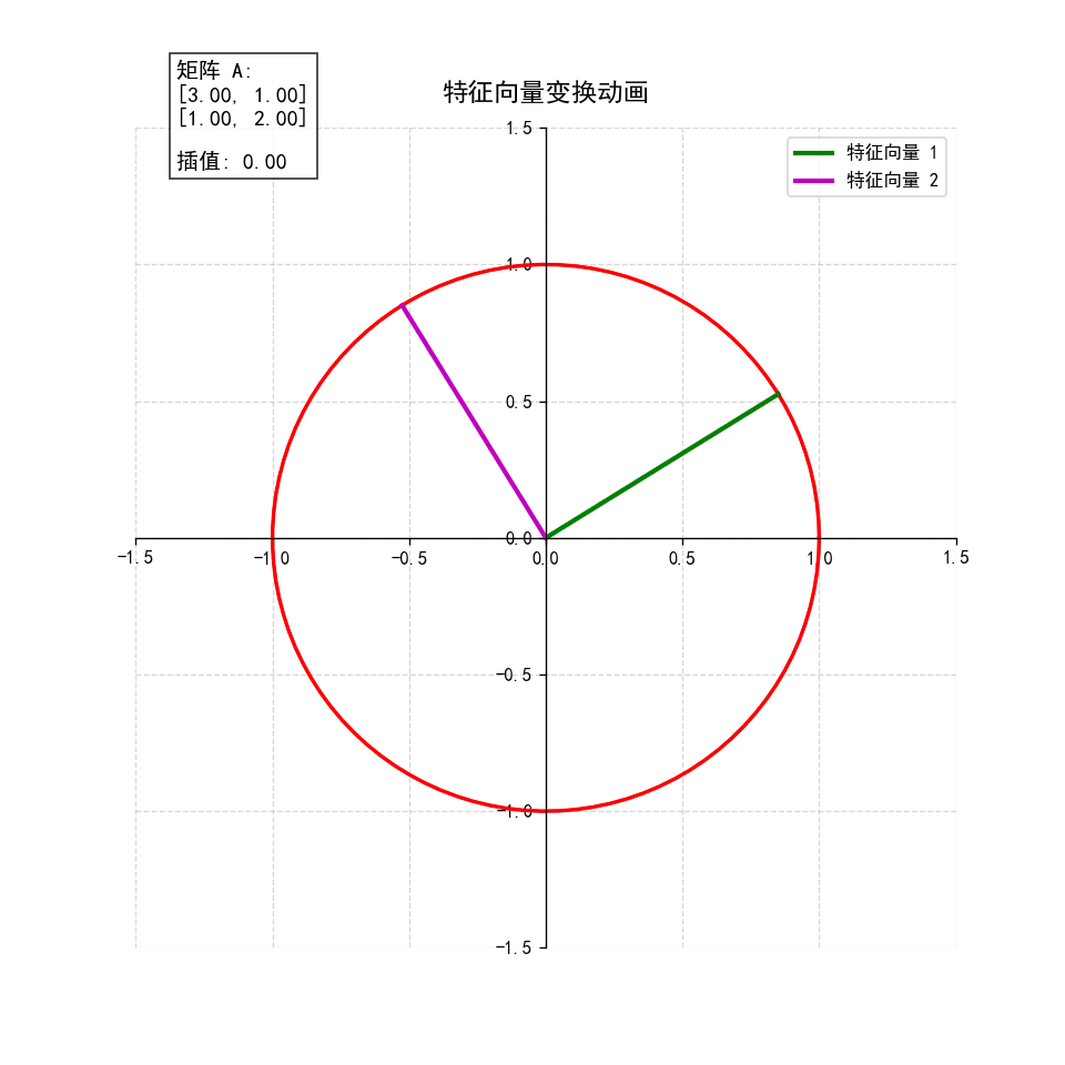 动画逻辑:从单位矩阵(无变换)逐渐插值到目标矩阵AAA,观察单位圆如何逐步变形为椭圆,特征向量始终保持方向不变,直观展现“特征向量是变换的主方向”这一本质。