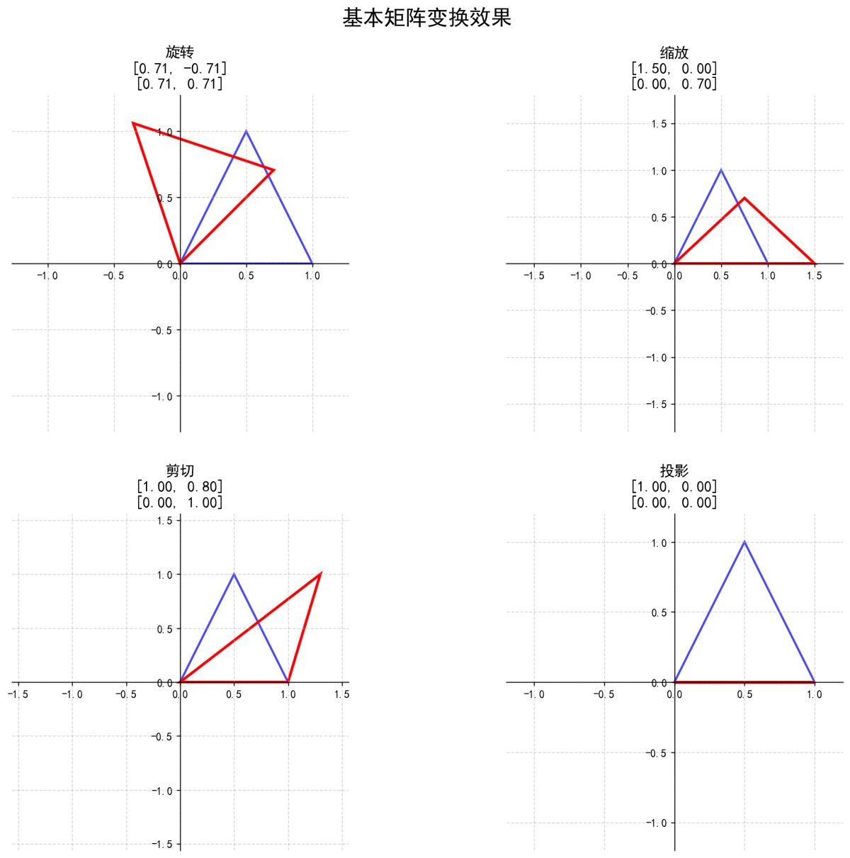 矩阵是线性变换的数值载体,每个2x2矩阵对应二维平面上的一种线性变换: