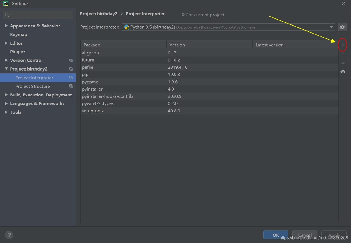 点开后,在project interpreter这里选择相应的文件,然后点击右侧的那个加号去添加我们需要的插件:pyinstaller;
