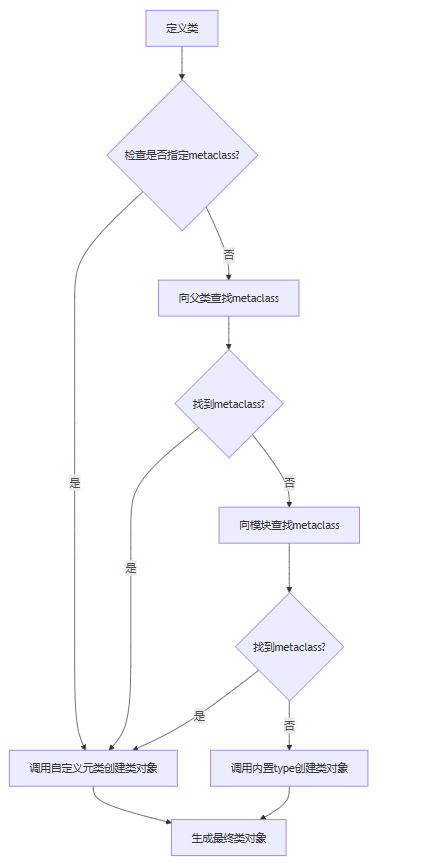 metaclass:当前类 → 父类 → 模块; - 任意一层找到自定义元类,就用它创建类;