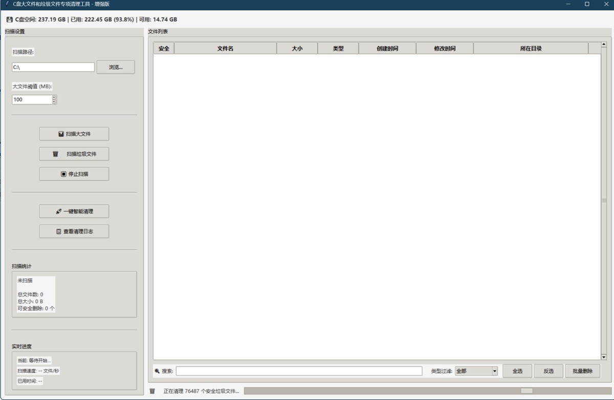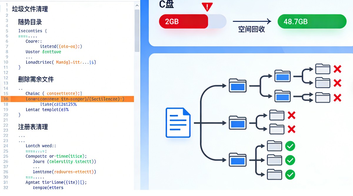 很多人会选择使用一些所谓的"系统清理工具",但效果往往不尽如人意。于是,我决定开发一套专业的C盘大文件和垃圾文件专项清理工具。令人惊喜的是,仅仅一次智能清理,C盘可用空间就从2GB猛增到了48.7GB,释放了46.7GB的空间!