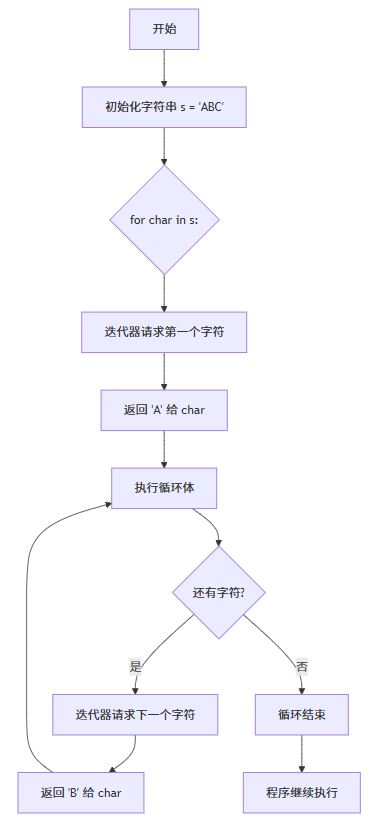 - 迭代器是幕后英雄:Python自动创建字符串的迭代器,管理"下一个字符"的获取